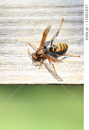 生き物 昆虫 キアシナガバチ、大きさは二センチ強。黄色と黒の縞模様で『近寄ると危険!』をアピール