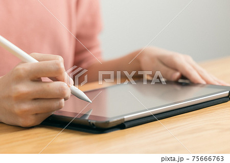 タブレットでオンライン署名する若い女性