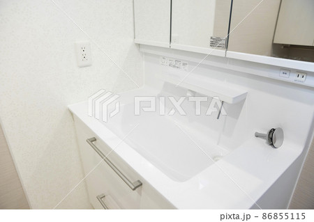 洗面台 (脱衣所 手洗い場 清潔 生活 鏡 ミラー 一軒家 マンション 棚 戸棚)