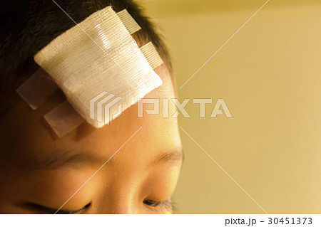 The lacerated suture wound of kid back head which suture with trauma the head by medical bandage