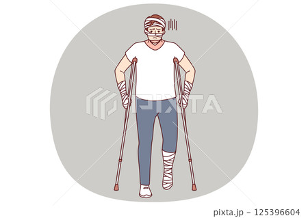 Ill man with bandages on hands and head uses walking aids after being involved in car accident