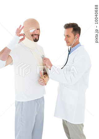 Doctor auscultating a patient tied up in bandage with stethoscop