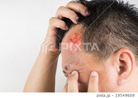 Focus on painful red swollen forehead injury