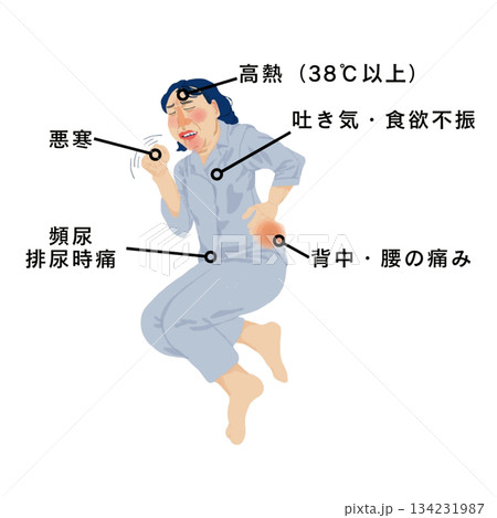腎盂腎炎の症状を示す女性患者の医療イラスト|高熱・悪寒・腰背部痛・排尿時痛