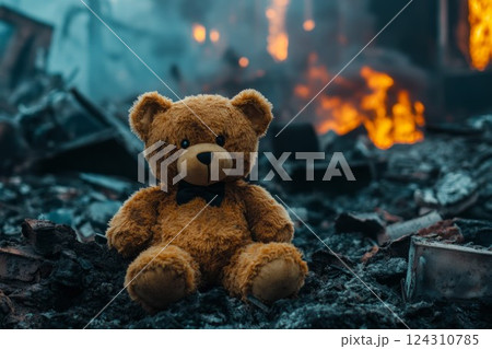 Teddy bear amidst urban ruins in smoky environment. Neural network AI generated