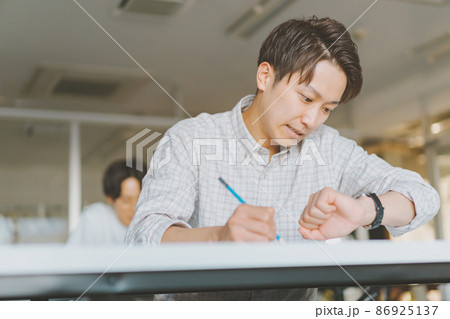 テスト中に時間を確認する学生