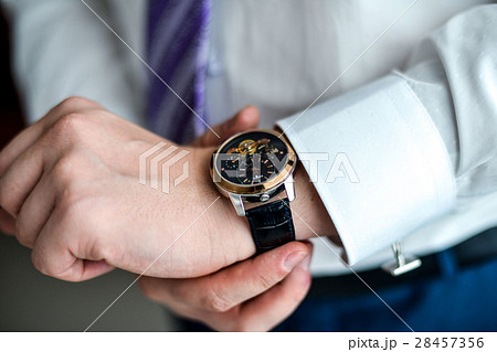 Men's wrist watch, the man is watching the time. Businessman clock, businessman checking time.