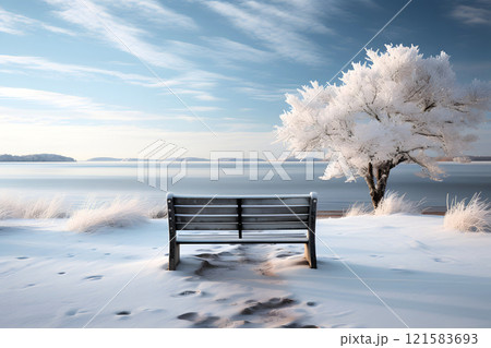 Embrace winter with cozy mittens on a snowy bench - perfect for holiday greeting cards. AI generation