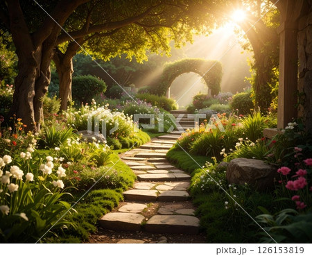 Romantic garden background for presentations and relaxing music posters, garden of Eden