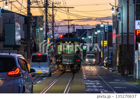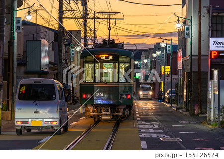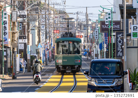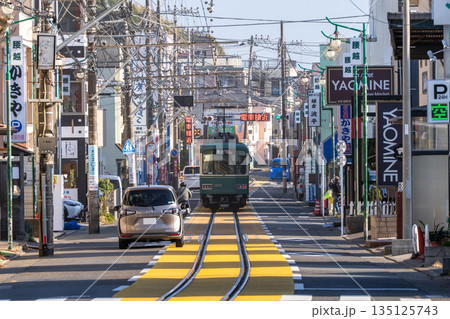 道路を走る江ノ電の風景