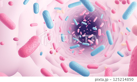 バクテリアのバランスが良いピンク色の小腸のイラスト。