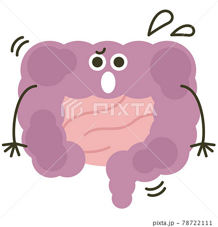 焦ってる大腸のキャラクター。便やガスでいっぱいの大腸のイラスト。