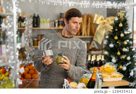 Adult man buyer choosing canned food in tin at supermarket for christmas table