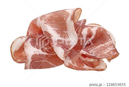 Pork brisket slices, smoked ham isolated on white background, full depth of field