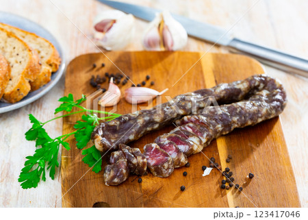 Delicious smoked salami sausage with salt, pepper, spices and herbs