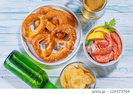 A vibrant photo showcasing a glass of beer surrounded by various snacks and fast food