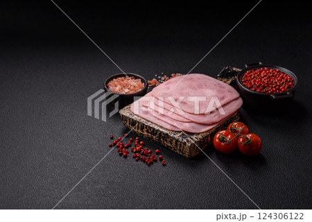 Pork brisket slices, smoked ham isolated on white background, full depth of field