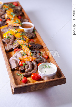 Barbecue of grilled meat and grilled vegetables outdoors.
