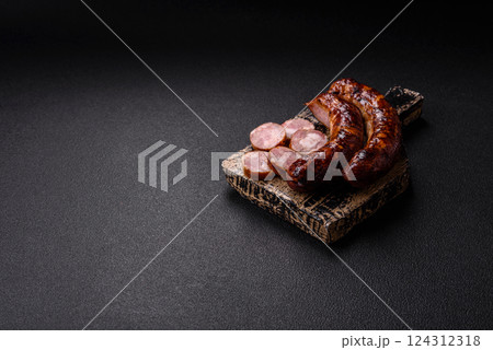 Delicious thin smoked hunting sausages with salt, spices and herbs