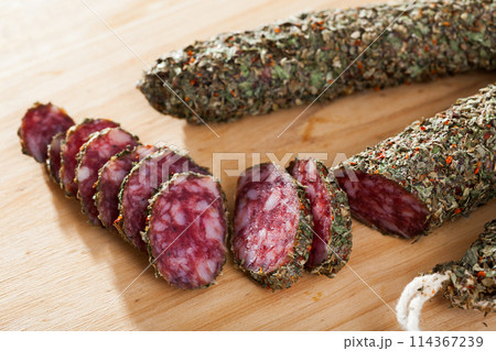 Delicious smoked salami sausage with salt, pepper, spices and herbs