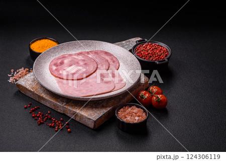 Mortadella Slice Isolated, Luncheon Meat Cut, Chicken Ham, Boiled Sausage for Breakfast