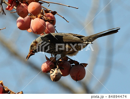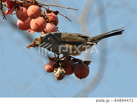 ジョウビタキ メスが木の枝の先に青空を背景にとまって休んでいる