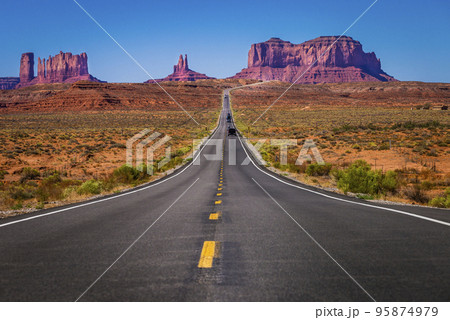 Highway Road U.S. Highway 163 and Monument Valley at sunset, Arizona, USA