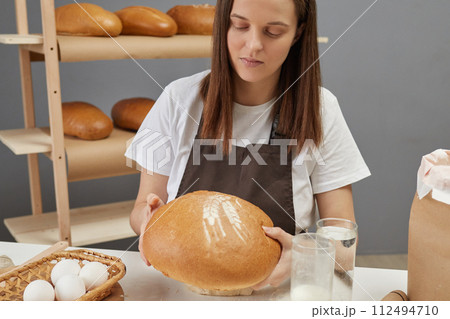 Professional woman baker holding fresh sourdough bread looking at freshly baked product pattern from flour or powder looks at result of her work in bakery