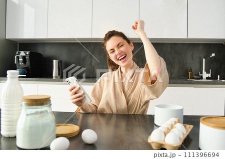 Attractive young cheerful girl baking at the kitchen, making dough, holding recipe book, having ideas