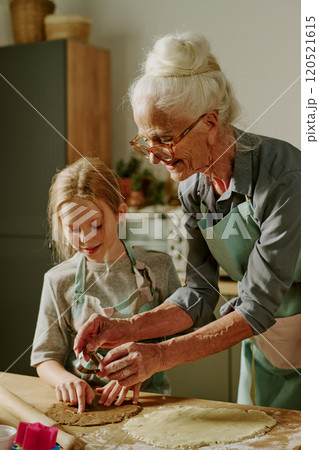 Elderly woman teaching young girl baking, both enjoying shared activity in cozy kitchen setting. Senior and child wearing matching aprons, surrounded by kitchen tools and ingredients
