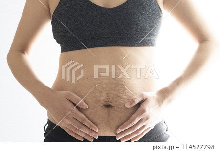 産後の妊娠線が残る女性のお腹のアップ