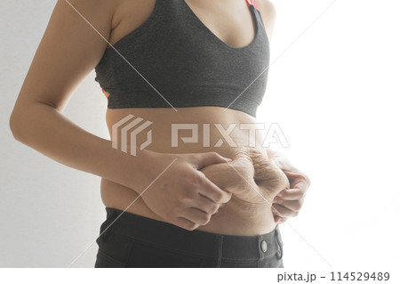 産後の妊娠線が残るお腹の肉をつまむ女性