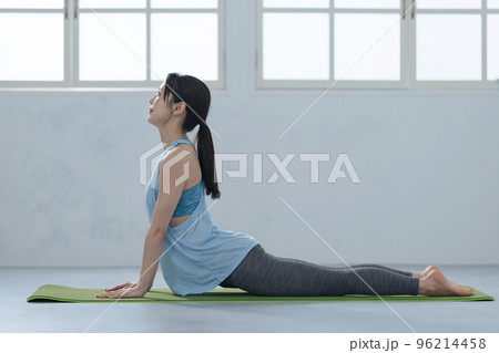 マンション室内で運動する筋トレ女子 ストレッチ ダイエット スポーツ ポニーテール