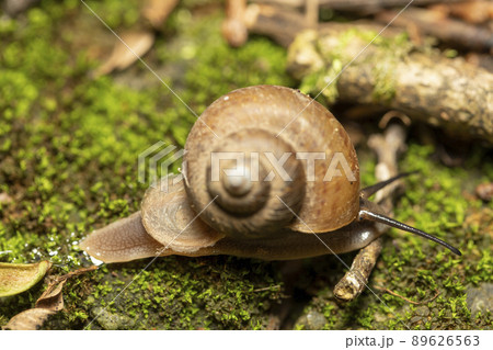 色帯生き物 巻貝 ニッポンマイマイ、からの周囲に不明瞭な色帯