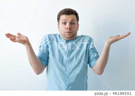 Portrait of man being surprised, handsome male spreading his hands up, posing isolated over yellow background, attractive unshaven guy wearing red casual t shirt. The concept of human emotions.