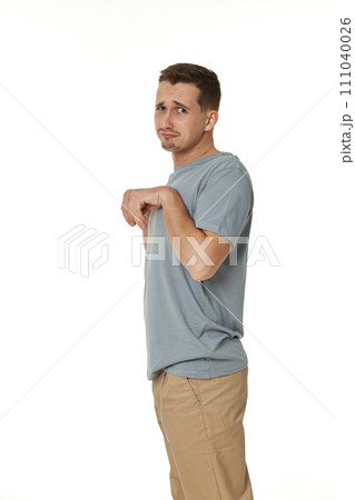 Young funny Caucasian man inflates cheeks. Closeup portrait