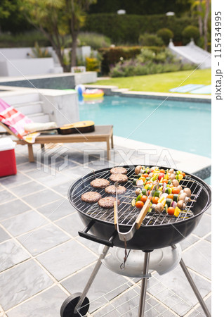 A charcoal grill is cooking burgers and vegetable skewers by a poolside with copy space