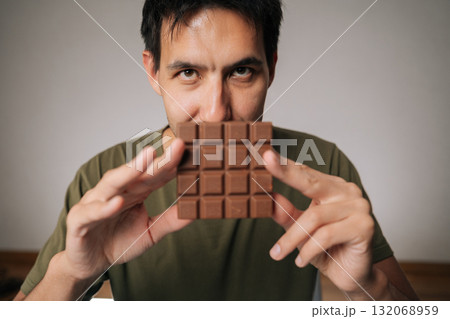 Happy young man holding chocolate bar in front of face, savoring delicious aroma, preparing to indulge in delightful sweet treat that promises pure enjoyment, sitting at table on isolated background