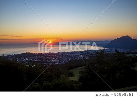 扇山から見た日の出の別府湾と別府市大分市街地の眺望