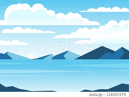 Blue landscape with sea and vessels vector illustration. Seaside with mountains. Scandinavian nature