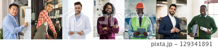 A group of seven professionals from diverse backgrounds stand confidently in different office settings. They are all smiling and looking directly at the camera.