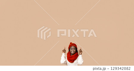A cheerful young African American woman with a big smile is wearing a cozy red hat and matching scarf. She is enthusiastically pointing upward at copy space