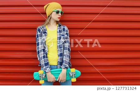 Stylish young woman with skateboard, modern teenage girl posing on city street, colorful wall
