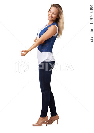Fashion, stylish and portrait of a woman with smile for clothing, style and body. Beautiful, happiness and full body of a model with fashionable clothes, femininity and confidence on white background