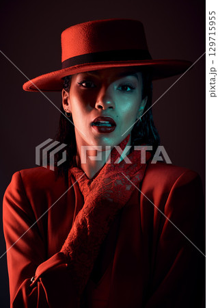 Sexy, fashion and portrait, dark with woman and makeup, retro style with edgy mystery, red aesthetic against studio background. Vintage, beauty and cosmetics with creative, art and fashion model.