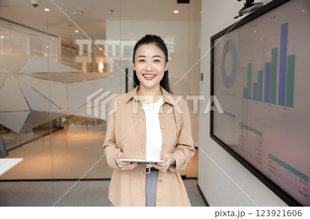 Woman holding white tablet, smiling at camera in training room with flip chart, papers, copy space