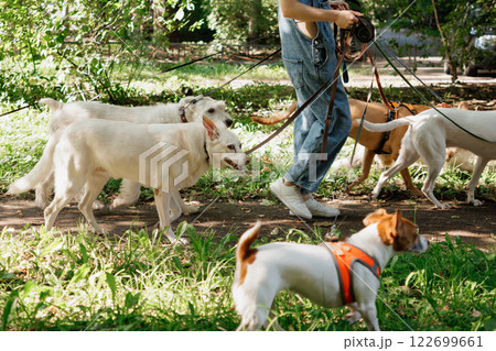 Dogs on walk in park. professional pet walker or pet babysitter, pack of animals on green lawn