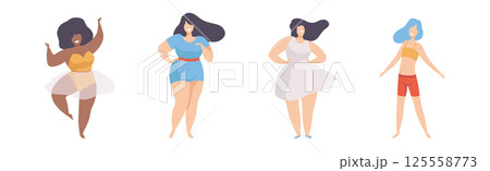 Pretty Body Positive Woman in Standing Pose Vector Set
