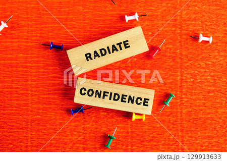 Concept words RADIATE CONFIDENCE assembled from wooden blocks in a composition with stationery pins on an orange provocative background, top view