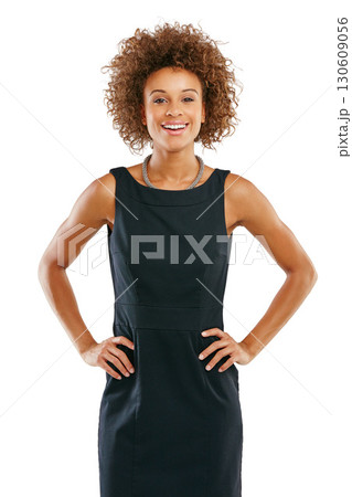 Happy, leader and portrait of business black woman with afro in elegant, corporate and professional fashion of people. Feminine worker style of confident person at isolated studio white background.